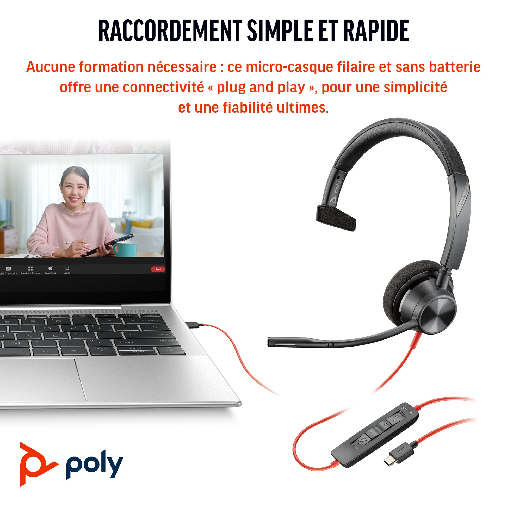Le Blackwire 3310 de Poly est un casque avec microphone conçu spécialement pour les environnements professionnels et un usage quotidien exigeant qualité, confort et fiabilité en communication filaire. Sa finition en noir offre un aspect élégant et discret, idéal pour les bureaux et espaces de travail corporatifs. Équipé d’une connexion USB, ce casque garantit une liaison stable et simple avec les appareils compatibles, facilitant son utilisation sans complications techniques. Son design mono-oreillette à arceau assure une ergonomie confortable pour de longues périodes, permettant à l’utilisateur de rester concentré sans gêne. De plus, il intègre un microphone omnidirectionnel qui capte la voix clairement sous plusieurs angles, améliorant nettement la qualité des appels et visioconférences. Avec un poids léger de seulement 103 grammes, le Blackwire 3310 allie légèreté, robustesse et stabilité, ajoutant à sa praticité. Ce modèle est certifié Microsoft Teams, optimisant son intégration aux plateformes de collaboration et communication d’entreprise, renforçant ainsi sa position comme outil professionnel pour les environnements de travail modernes. En résumé, le Blackwire 3310 combine solidité technique, confort et facilité d’utilisation dans un produit répondant efficacement aux besoins communicatifs des utilisateurs professionnels et corporatifs.