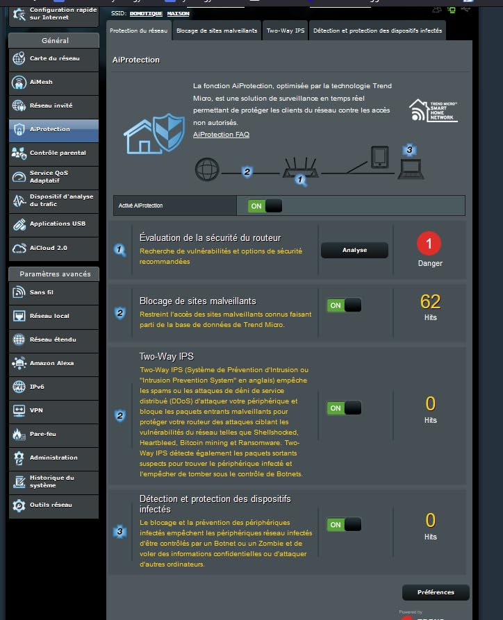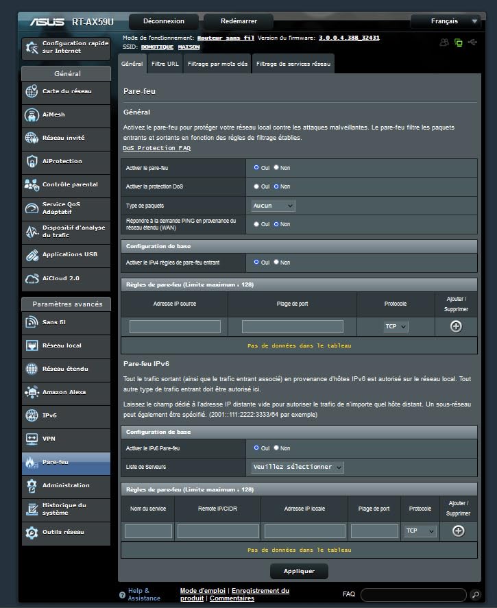 | Caractéristiques | Protection par firewall, WOL, IGMP snooping, prise en charge d'IPv6, contrôle parental, mode IP statique, redirection de port, bouton de réinitialisation, prise en charge IPv4, déclenchement de port, double flux (2x2), ASUSWRT, technologie MU-MIMO, journal de système, ASUS Router App, support DMZ, ASUS AiMesh, ASUS AiProtection Classic, Bandwidth Limiter, client OpenVPN, client PPTP VPN, serveur OpenVPN, support TV IP, bouton WPS, Guest Network, mode de nœud AiMesh, fonction modem Android, Bandwidth Monitor, Bloqueur de sites malveillants, client VPN L2TP, serveur VPN IPSec, serveur VPN PPTP |