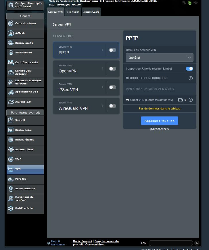 | Protocole réseau / transport | PPTP, L2TP, IPSec, PPPoE, DHCP, DDNS |