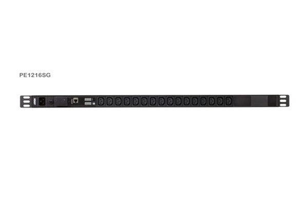 Le PDU de base série PE1216S propose 16 prises IEC C13 sur un bandeau rackable verticalement (zéro U) avec protection contre les surtensions, pour protéger parfaitement les appareils connectés au PDU