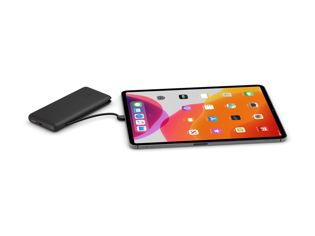 Une batterie externe 10K avec câbles intégrés vous permet de recharger votre iPhone sans emporter de câble de recharge supplémentaire ou de recharger deux appareils en même temps. Rechargez des smartphones et tablettes en simultané avec les câbles USB-C et Lightning de la batterie externe. Et profitez de l'alimentation Pass-Through qui permet de garder la batterie externe rechargée pendant que cette dernière recharge votre téléphone. | |