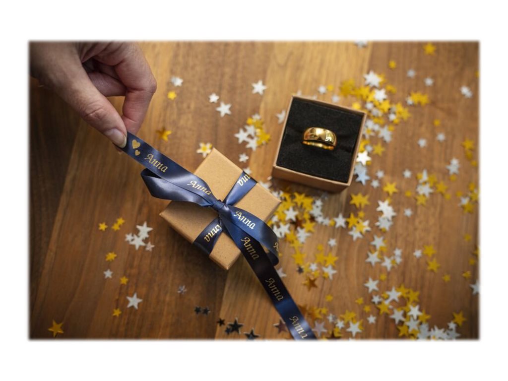 Ajoutez une touche personnelle à vos cartes et à vos cadeaux avec le ruban tissu TZe-RN34 Brother or sur bleu nuit. Ces étiquettes luxueuses sont le moyen ultime de personnaliser vos cadeaux, que ce soit lors d'occasions spéciales ou tout simplement pour ajouter une touche originale. La cassette à ruban de votre étiqueteuse P-touch est facile à remplacer. Vous bénéficiez d'un grand choix de largeurs, de couleurs et de matériaux pour créer à l'infini. |
