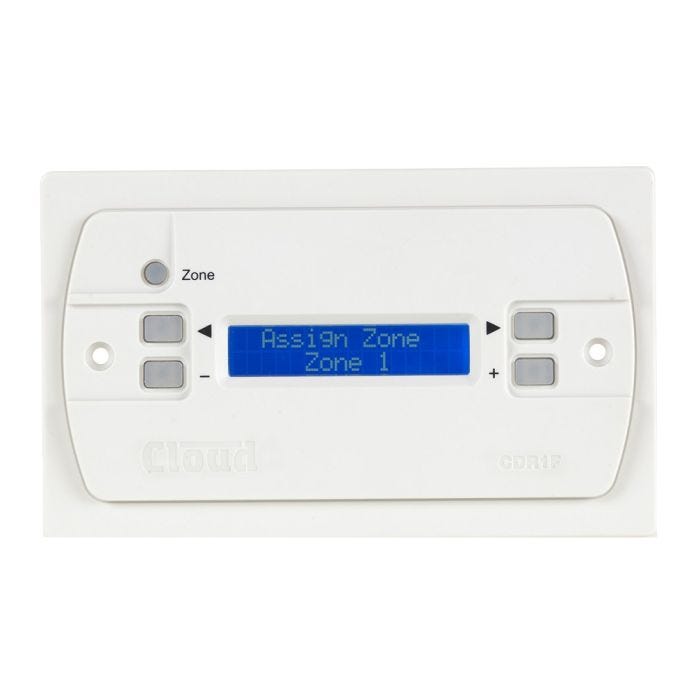 Les versions disponibles sont: • CDR-1B – platine de commande en montage saillie, finition noire • CDR-1W – platine de commande en montage saillie, finition blanche • CDR-1FB – platine de commande en montage encastré, finition noire • CDR-1FW – platine de commande en montage encastré, finition blanche • CDR-1FS – platine de commande en montage encastré, finition argent Caractéristiques: > Permet le contrôle à distance du mélangeur de contrôle numérique DCM-1 de Cloud > Simple à installer - se connecte au DCM-1 et à d'autres CDR1 / 1F à l'aide d'un câble CAT-5 standard > Peut être interconnecté à l'aide d'un large choix de topologies de câblage > Affichage alphanumérique à matrice de points rétroéclairé à 2 lignes x 16 caractères > Fonctions accessibles à l'utilisateur: - Sélection de la source - Niveau de contrôle - Activer / désactiver le groupe > Fonctions du mode ingénieur (mot de passe activé): - Réglage de l'égaliseur de la zone locale > Mode installateur (activé par cavalier interne): - Affectation de zone - Réglage du mot de passe - Réglage de l'affichage - Temps d'inactivité (temps pendant lequel le rétroéclairage de l'écran reste allumé après avoir appuyé sur un bouton)