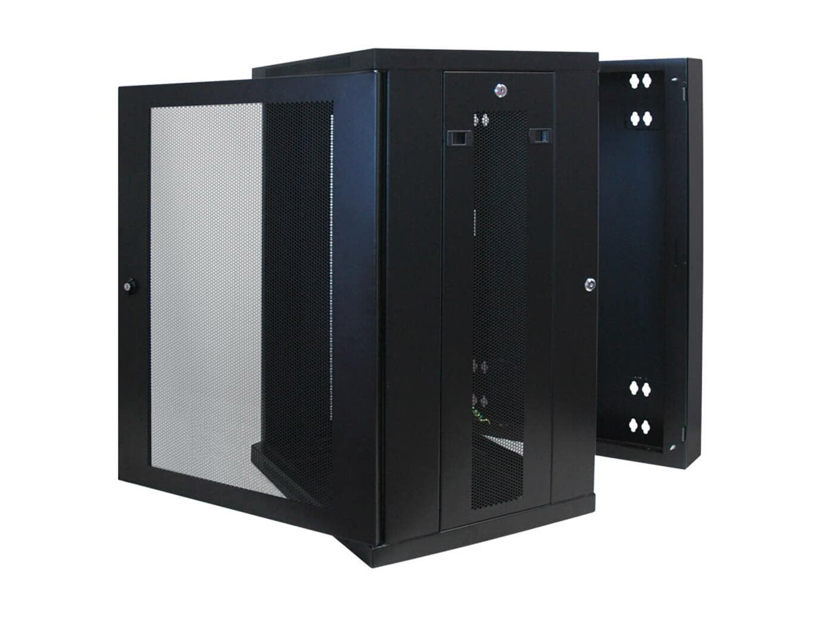 | Armoire rack à montage mural, profondeur de commutateur et profil compact 18U SmartRack, fond à charnières. | |