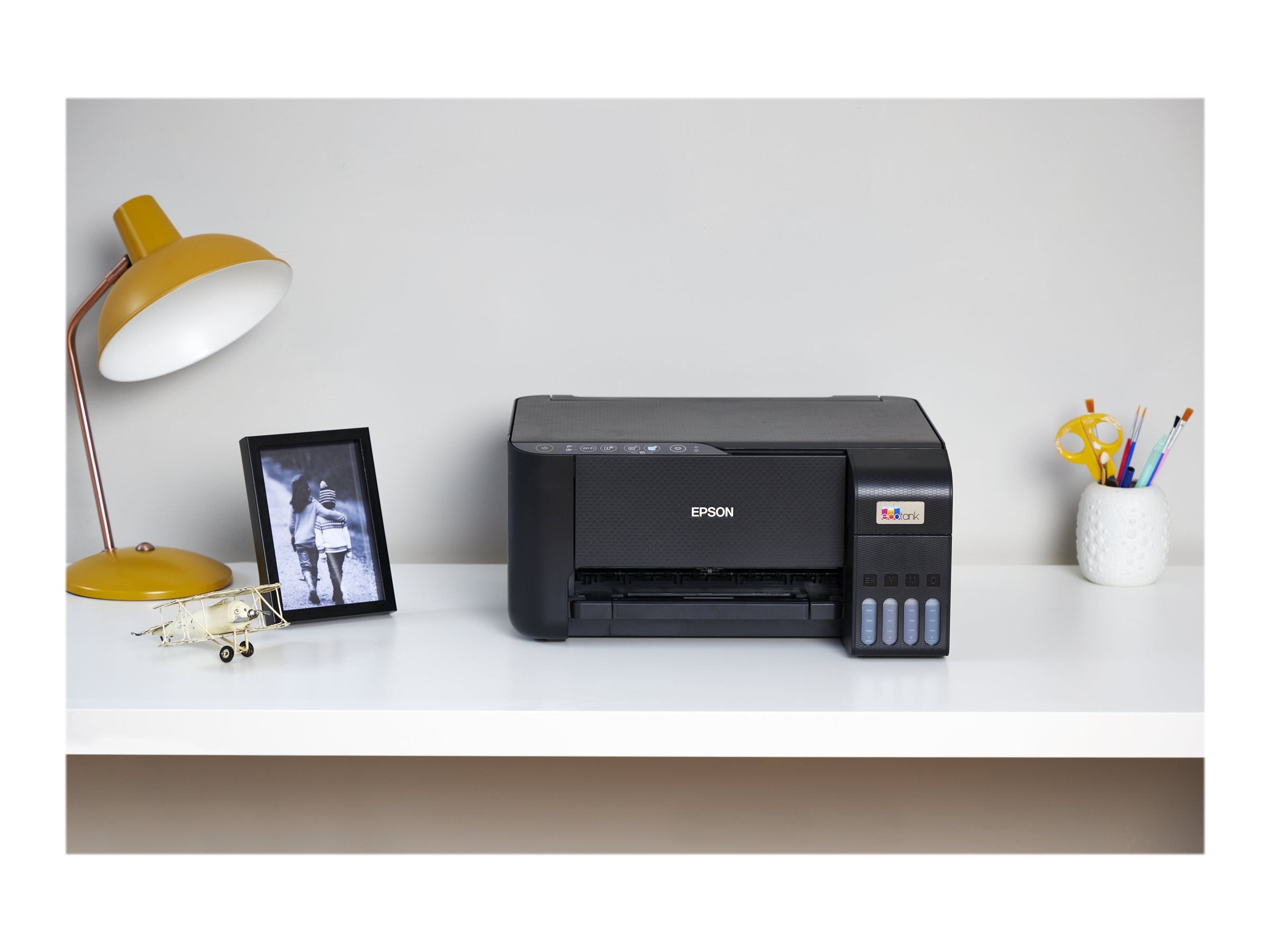 EcoTank offre une impression à domicile simple: les réservoirs d'encre ultra haute capacité sont facilement rechargeables et les bouteilles sont dotées d'un détrompeur pour ne plus se tromper de couleur en remplissant le réservoir. Avec l'affichage du niveau de l'encre en façade, il est facile de savoir quand une recharge est nécessaire. Économies à long terme Cette imprimante multifonction vous permet d'économiser jusqu'à 90% sur vos coûts d'impression et elle est livrée avec jusqu'à 3ans d'encre. Un jeu de bouteilles d'encre permet d'imprimer jusqu'à 4500pages en monochrome et 7500pages en couleur, soit l'équivalent de jusqu'à 72cartouches d'encre!* Application Epson Smart Panel Cette application vous permet de contrôler votre imprimante à partir de votre appareil mobile. Vous pouvez imprimer, copier et numériser des documents et des photos, mais aussi configurer, surveiller et dépanner votre imprimante, le tout depuis votre téléphone ou votre tablette. Nombreuses fonctionnalités Grâce à un bac papier arrière de 100 feuilles, à l'impression photo sans marge (jusqu'à 10 x 15 cm) ainsi qu'à des vitesses d'impression pouvant atteindre 10pages par minute, vous pouvez effectuer rapidement plusieurs tâches en toute simplicité. Flexibilité moderne Grâce à son design compact et à sa connectivité Wi-Fi et Wi-Fi Direct, vous pouvez facilement intégrer cette imprimante multifonction à votre installation et imprimer depuis les appareils mobiles, tablettes et ordinateurs portables. Durabilité Grâce à la technologie d'impression Zéro Chaleur, la durée de vie de la tête d'impression est la même que celle de l'imprimante, ce qui réduit le nombre de pièces de rechange ou de mises à niveau superflues, ainsi que la consommation électrique. L'imprimante est également conçue pour que les buses ne s'obstruent pas. |