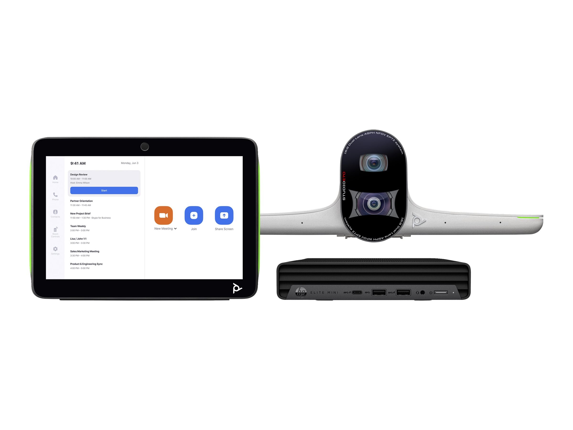 Contenu du kit | Caméra Poly Studio E70, contrôleur tactile Poly TC10, Mini PC de conférence HP |