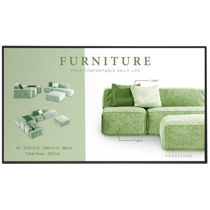 Compatible portrait et paysage , il offre un angle de vision de 178° , une profondeur de couleur 10 bits via FRC , et une durée de vie minimum de 50 000 heures , répondant aux exigences des installations digitales commerciales.