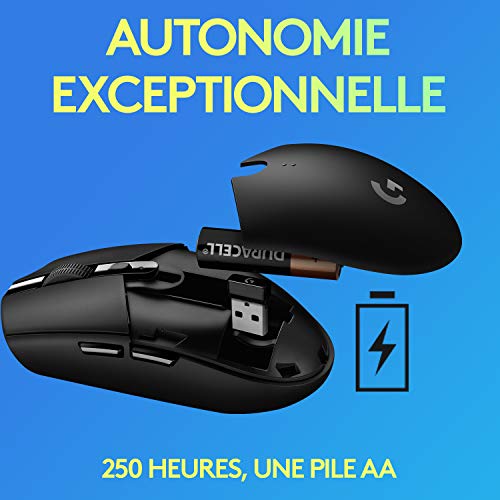 | Caractéristiques | Molette de défilement, 6 boutons programmables, capteur HERO, logement de récepteur sans fil, récepteur sans fil Nano, processeur ARM 32 bits, technologie LIGHTSPEED |