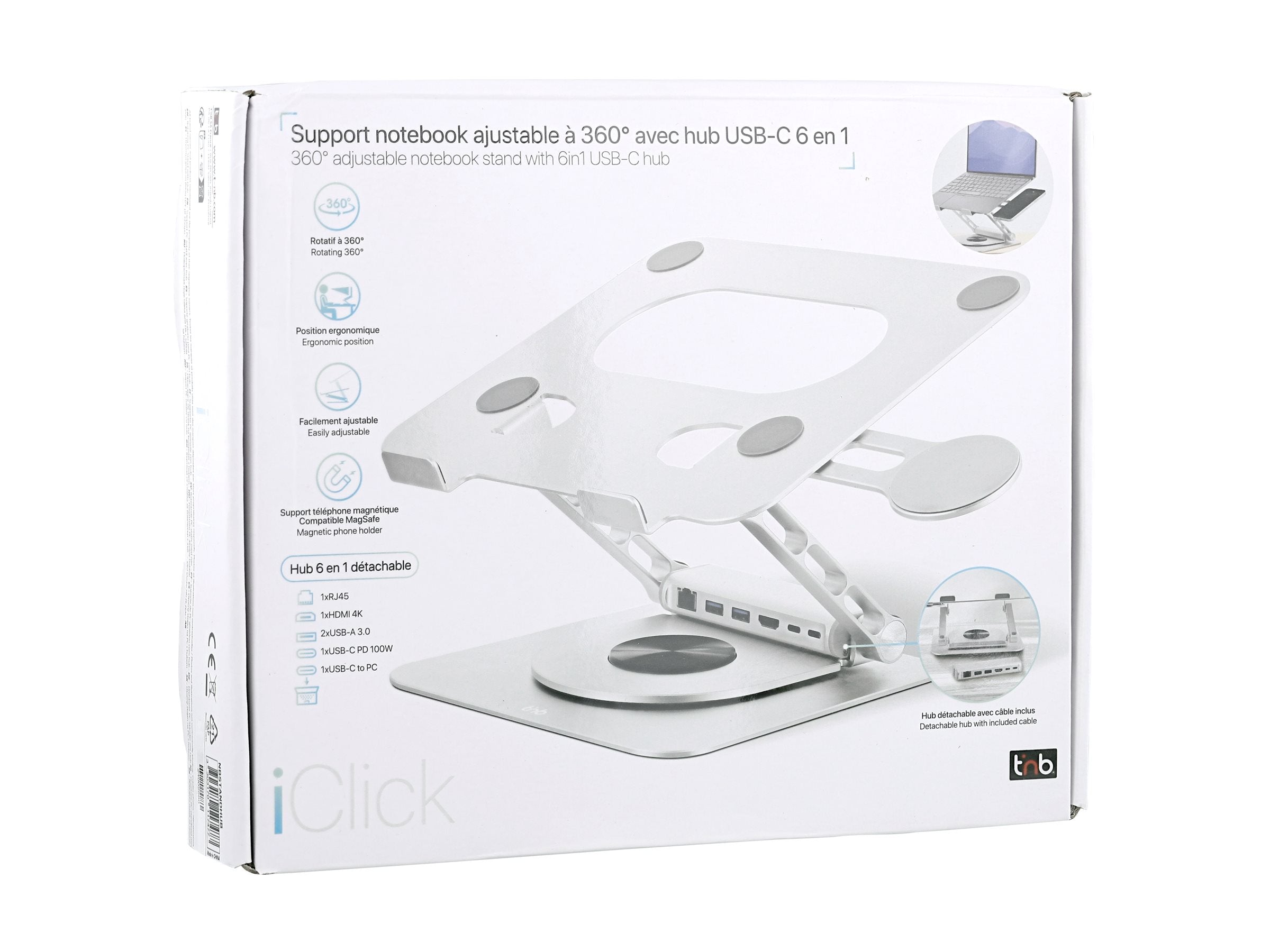 La station d'accueil T'nB iClick + support pour ordinateur portable offre une connectivité et des fonctionnalités essentielles pour les utilisateurs modernes. Prenant en charge des connexions telles que SuperSpeed USB 3.0, USB-C et HDMI, elle s'adapte à divers appareils, y compris les ordinateurs portables jusqu'à 17 pouces. Une caractéristique notable est la puissance de 100 W, qui permet aux utilisateurs de charger efficacement leurs appareils tout en utilisant le hub. Le boîtier en aluminium offre une grande durabilité et ajoute une esthétique élégante à tout espace de travail.