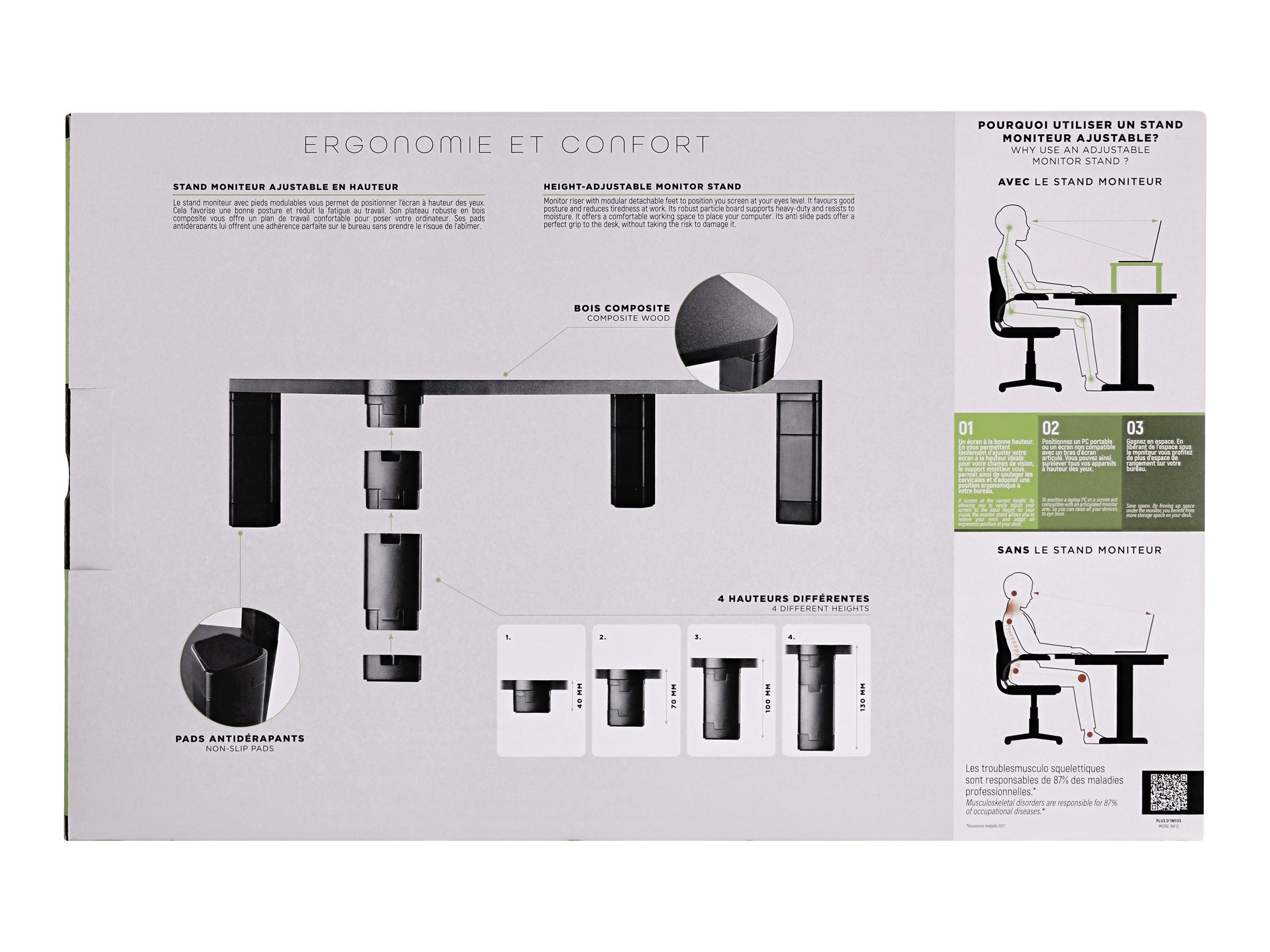 Le stand moniteur avec pieds modulables vous permet de positionner l'écran à hauteur des yeux. Cela favorise une bonne posture et réduit la fatigue au travail.